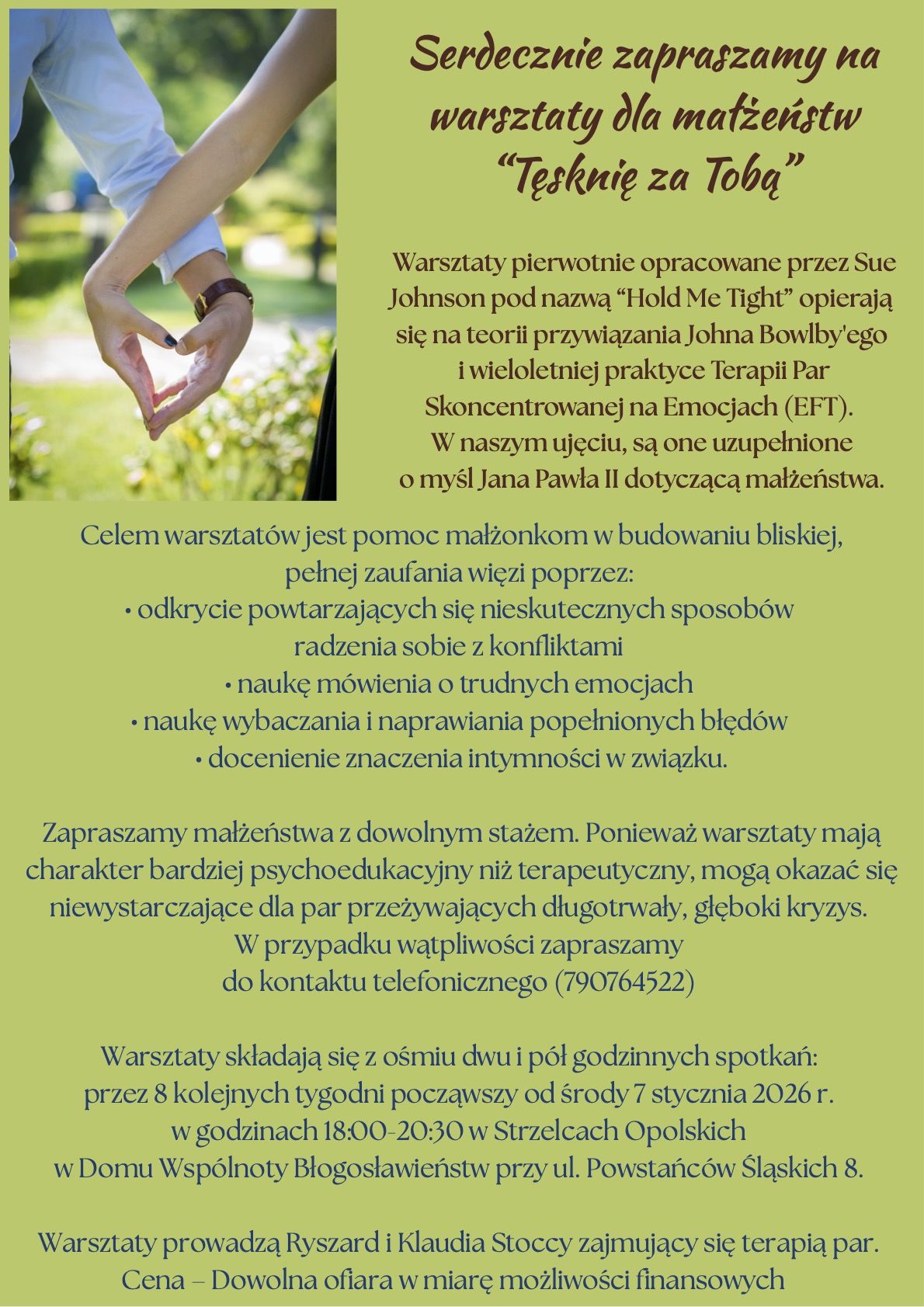 Jesteśmy głęboko przekonani o wyjątkowej wartości terapii EFT oraz rozumienia miłości jako celowej i dojrzałej współzależności. Jest to zbieżne z myśleniem Jana Pawła II wyrażonym w teologii ciała. Zdajemy sobie sprawę że psychoterapia może być niedostępna dla wielu par z powodów finansowych. Dlatego po ukończeniu kursu prowadzenie warsztatów dla par, zdecydowaliśmy się rozpocząć też taką formę pomocy. Pierwsze warsztaty we współpracy z Siostrami ze Wspólnoty Błogosławieństw rozpoczynamy w styczniu 2026. Poniżej szczegółowe informacje.